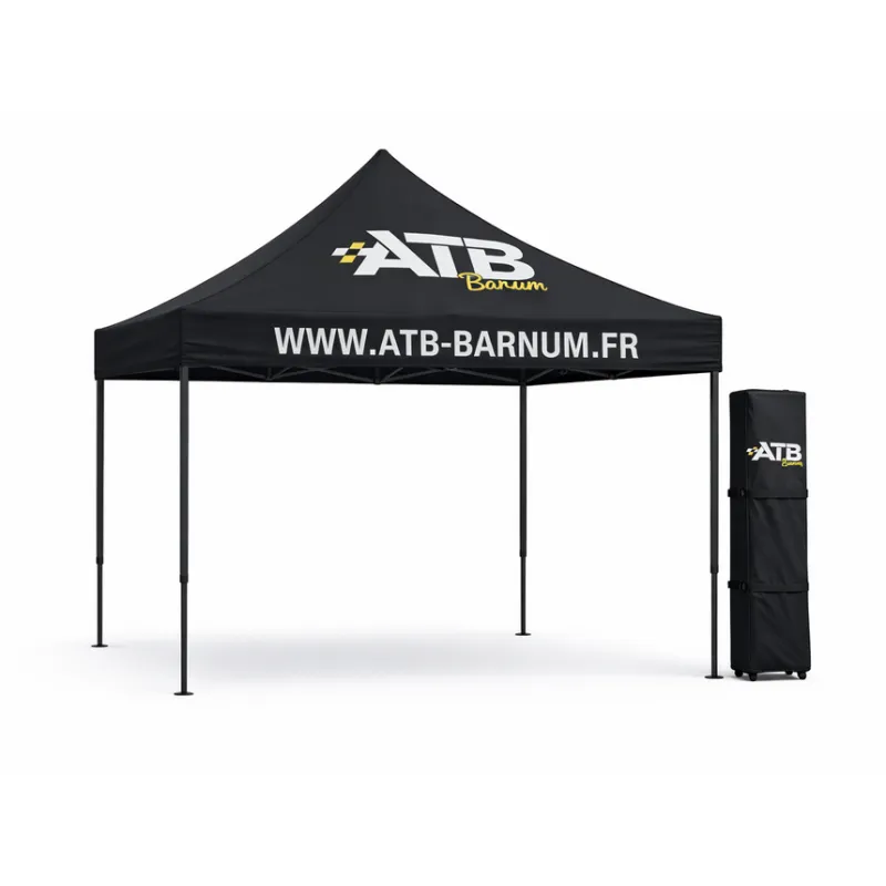 Affichez nos couleurs est payez votre barnum moins cher économique et pratique pour vos événements ou activités en extérieur comme le karting, moto-cross, circuit. Découvrez notre tente pliable noire 3x3m Gamme Sponsor, conçu pour allier praticité et visibilité. Kit stand : structure + toit + sac de protection avec fermeture éclair. Nous garantissons un service après-vente réactif et complet sur l’ensemble des pièces de nos barnums en acier.