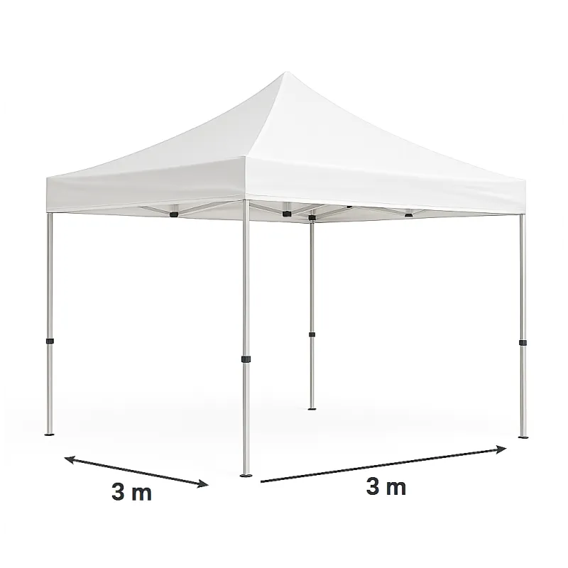Alliez efficacité et visibilité avec notre stand pliable 3mx3m professionnel Blanc sans parois de côté avec 9m2 de surface. Poids 33kg sans murs de côtés. Idéal pour vos événements en plein air, ce barnum pliant 3x3m avec structure en aluminium vous protègera tout en valorisant votre présence. En prime, léger Il se monte en un clin d’œil, il vous offre une protection contre les intempéries est une belle visibilité. Livré avec sac de transport, kit d'arrimage est un pack de 4 poids de lestage à remplir.