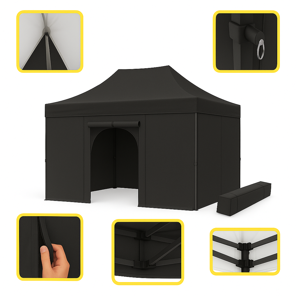 Pensé pour les passionnés d’événementiel, au design noir élégant combine praticité et fiabilité. Poids 32kg avec murs de côtés, Livré sans logo sur le toit (neutre). Armature 2x3m acier renforcé 40mm offre une tenue impeccable même en usage intensif. Toit et parois polyester 320 g/m², doublée d’une induction PVC, bloque efficacement la pluie et les rayons UV. Facile à installer et à démonter, ce modèle se transforme aussi en tonnelle polyvalente pour abriter du matériel, exposer vos produits ou accueillir vos invités. Solide, fonctionnel et esthétique. Livré avec sac de transport, kit d'arrimage est un pack de 4 poids de lestage à remplir.