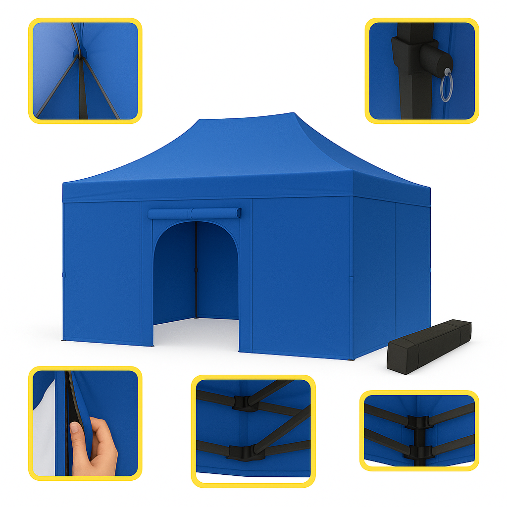 Allie élégance et praticité pour tous vos événements extérieurs. Poids 44kg avec murs de côtés, sa structure pliante de 3x4.50m renforcé de 40 mm assure une tenue irréprochable, toit polyester 320 g/m² avec induction PVC offre une protection imperméable et anti-UV, livré sans logo sur le toit (neutre). Avec ses 3 parois et sa porte zippée, il devient un stand fermé, idéal pour marchés, foires, rallyes ou manifestations sportives. Facile à déployer et à transporter. Un modèle fiable et esthétique dans la gamme des barnums haut de gamme acier. Livré avec sac de transport, kit d'arrimage est un pack de 4 poids de lestage à remplir.