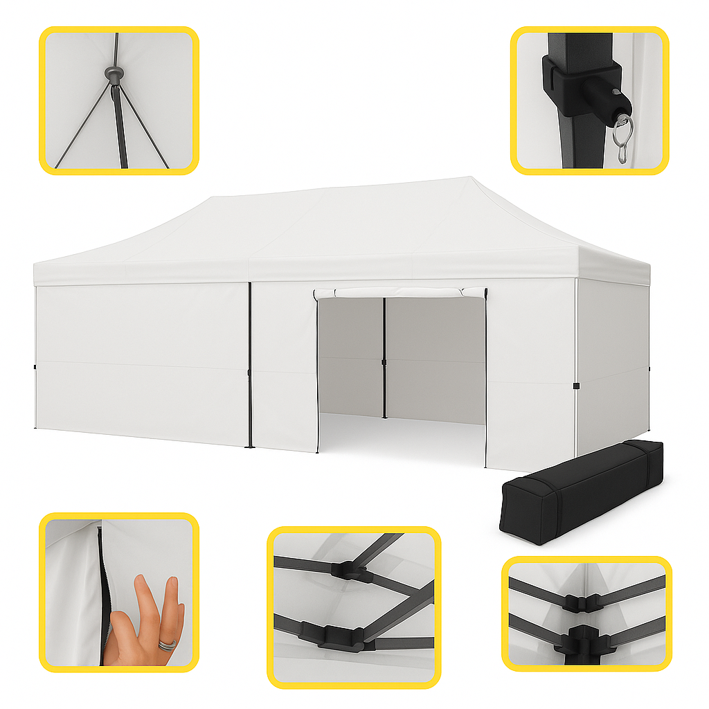Luminosité & mise en scène pour ce barnum Blanc 3x6 m valorise vos produits sur 18 m² de surface Poids 56kg avec murs de côtés, sans logo sur le toit (neutre). Son armature acier avec 6 poteaux carré en 40 mm et sa toile polyester 320 g/m² à induction PVC assurent une tenue sûre, imperméable et anti-UV. Le pack parois de côté (3 parois + 1 porte) permet de passer d’un stand ouvert à un espace fermé en quelques instants. Idéal pour marchés, rallyes, foires, dégustations en plein air.Livré avec sac de transport, kit d'arrimage est un pack de 4 poids de lestage à remplir.